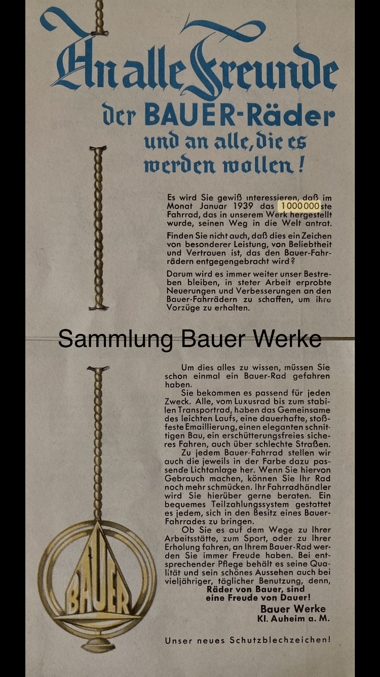 Laut den Angaben von Bauer selbst, war es Januar 1939…IPimpYourFahrrad hat geschrieben: Fr 27. Jan 2023, 08:45 Die 1.000.000 soll im Herbst 38 überschritten worden sein.