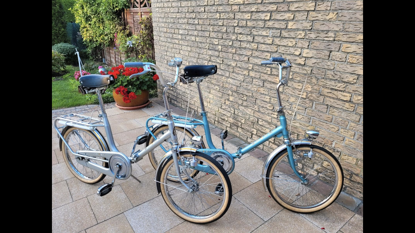 Hier das Standart Modell mit 20 Zoll Bereifung und das 26 Zoll Rad, in zwei Teile zerlegbar. Beide Varianten sind in einer Preisliste aus dem Jahr 1967 als „Klapprad“ bezeichnet.