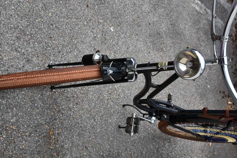 Das Rad war nagelneu und damals ein echter Dachbodenfund, einzig mit kleineren Lagerschäden an der HR-Nabe und hinteren Felge. Trotzdem war alles im Neu- und Originalzustand beieinander, mit Ausnahme der Schutzbleche. Die waren nicht die originalen. Freundlicherweise hat mir daraufhin Heinz Fingerhut das letzte passende „runde“ Pärchen ohne Sicken mit 65mm Breite aus Altbestand überlassen, das mir @Slotdragster neu lackieren ließ und anschließend per Hand linierte. Ich gab‘ ihm noch in Brückenau den orginalen Kettenschutz als Vorbild für die Farbe und Dicke der einzigen tiefblauen Linie mit: er hat es professionell gelöst!! Danke! Ein ganz besonderes Highlight an diesem Rad sind die extrem raren originalen Wanderer Celluloid Griffe, die es vermutlich auch nur 1933 und 1934 gab.