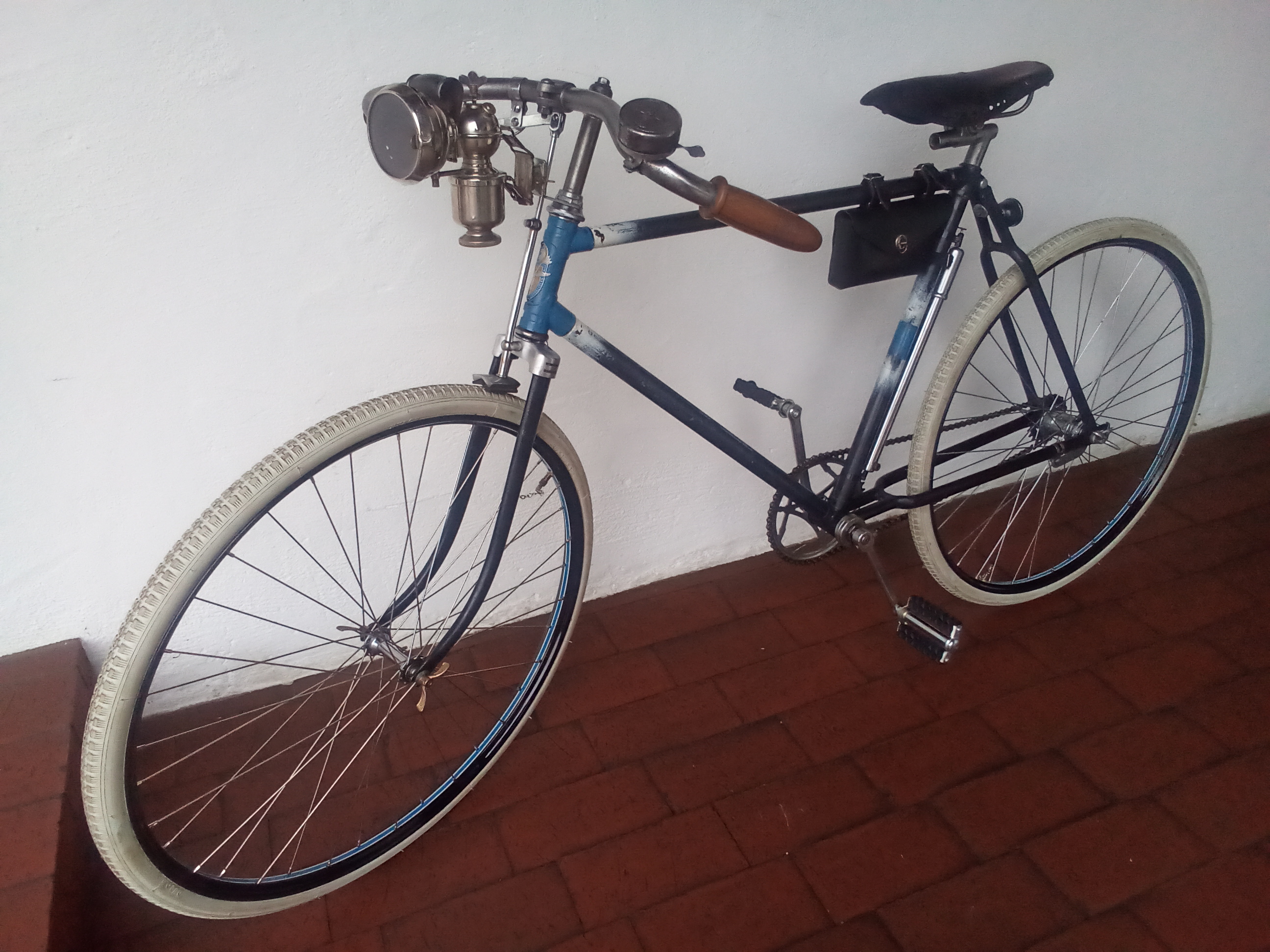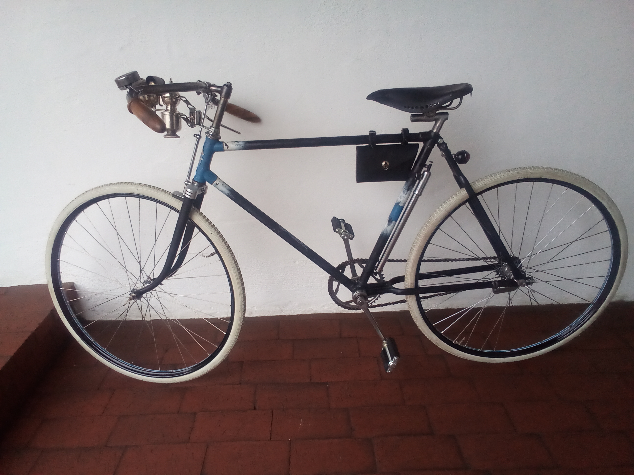 Hatte ein Excelsior BJ 51 hinterm Schuppen im Freien. Mit Algen und Moos, ohne Sattel, gebrochenem Lenker, Tretlager fest, Vorderradfelge durchgerostet, Nabe hinüber. Dann kam ich auf die glorreiche Idee einen " Halbrenner " zu basteln. Also Rahmen und Nabe raus. Lack neu dekorieren, Naben mit NOS Felgen einspeichen. Lenker und Sattel besorgt. Den Rest aus meinem Fundus. Karbitlampe ran ( Unsinn ) neue Drahtreifen ,schwer zu bekommen (622 weiß ohne Reflex mit altem Profil) montiert , alles auf alt getrimmt , fertig. Aber, nicht aufgepasst, der Lenkkopf war verzogen , 2cm am Reifen . Alles wieder zerlegt,den Rahmen kalt gerichtet, und zusammengebaut. Der Pseudo Oldtimer war fertig. Bitte nicht steinigen, aber irgendwie doch "" cool " . Aber schaut selber